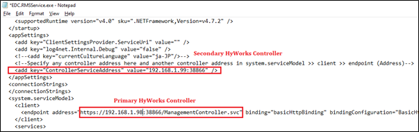 <appSettings\>, set ControllerServiceAddress as the secondary HyWorks Controller, e.g.,<add key="ControllerServiceAddress" value="192.168.1.99:38866"\> -