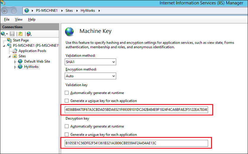 Enter the copied validation key and decryption key saved in step 6 of the previous section - HyLabs Server 1 (IIS Configurations on HyLabs/HyLabs servers).