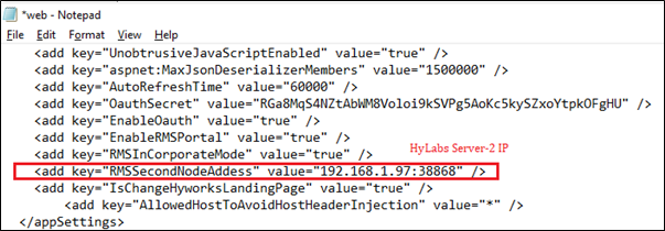<appSettings\>, check for the tag RMSSecondNodeAddess and set its value to the IP address of the 2nd HyLabs server with port as 38868, e.g.,<add key="RMSSecondNodeAddess" value="192.168.1.97:38868"\></add\>