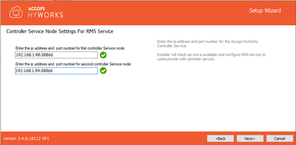 For Controller Service Node Settings for RMS Service, provide IP address and port number for the first HyWorks Controller and port and second controller service node e.g., 192.168.1.99:38866