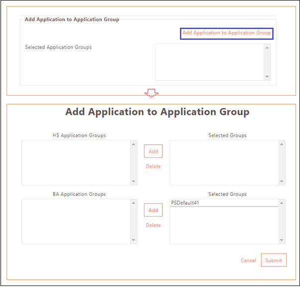 - Select the application group, click Add > Submit (Select the group in which the controllers and network range have already been added).