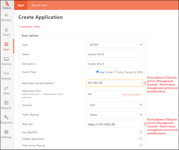 Field name Value Type HTTPS Name Logical name, e.g., HyLabs OAuth Application Server Address IP of Primary HyLabs server. Provide the address of the HyWorks server when the HyLabs server and the HyWorks server are installed on the same machine. Refer to the screenshot below. Description Logical description of the application Tunnel Type App tunnel Application Port 443 Protocol TCP Traffic Routing Allow Web URL IP of Primary HyLabs server in the format as https:// , e.g., https://192.168.1.96. Provide the address of the HyWorks server when the HyLabs server and the HyWorks server are installed on the same machine. Refer to the screenshot below. Use Web VPN (in v5.4 or later) or Use Reverse Proxy (in older versions) Keep it Unchecked Hidden Application Keep it Unchecked Hide Application Access Pop-up Keep it Unchecked