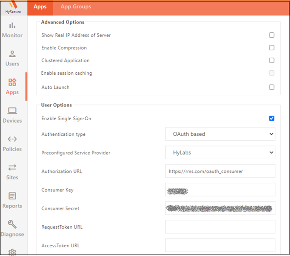Field name Value Enable Single Sign-On Option Enable Authentication Type OAuth based Pre-configured Service provider HyLabs (for v5.4 or above), RMS for older versions Authorization URL https://rms.com/oauth_consumer Consumer Key The key, obtained at the time of configuring the authorization server Consumer Secret The secret, obtained at the time of configuring the authorization server Request Token URL Keep it blank Access Token URL Keep it blank