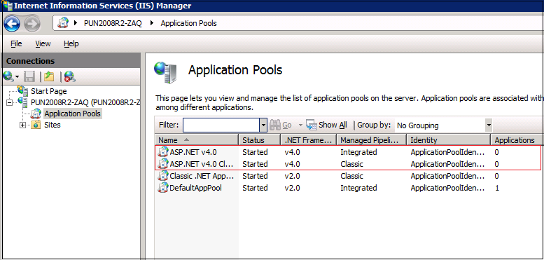 Verify if the ASP.NET 4.0 pool is listed (See the screenshot below).