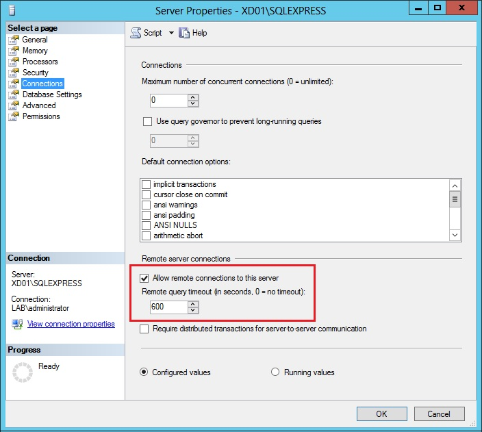 Under the Remote server connections section, select the Allow remote connections to this server.