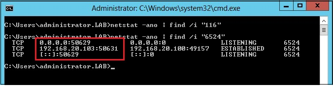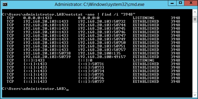 netstat -ano | find /i \<PID of SQL Server>e.g. netstat -ano | find /i "116"