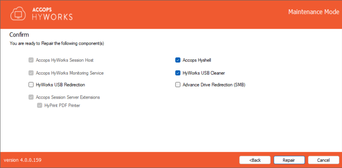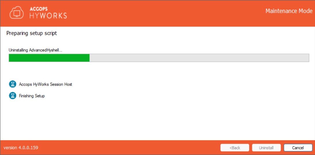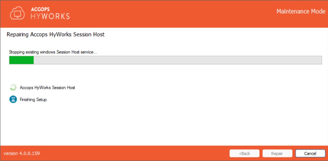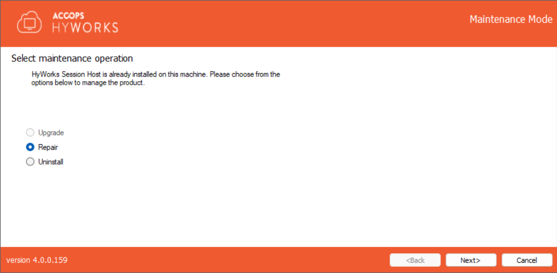 The HyWorks Session Host Server Installation wizard will open in Maintenance mode.