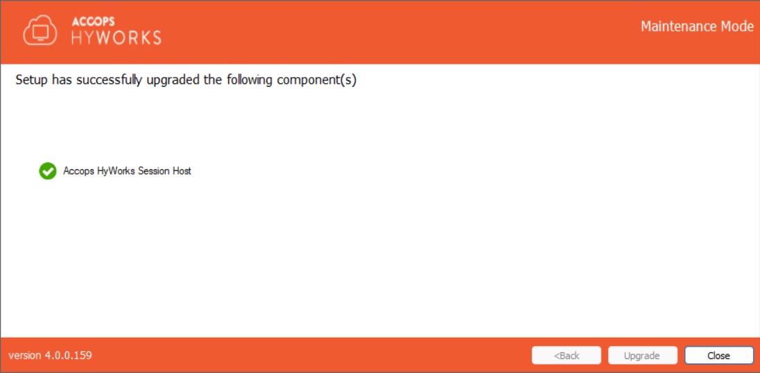 All the HyWorks Session Host Server components will be upgraded, and a success screen will be displayed. Click Close to exit the setup.