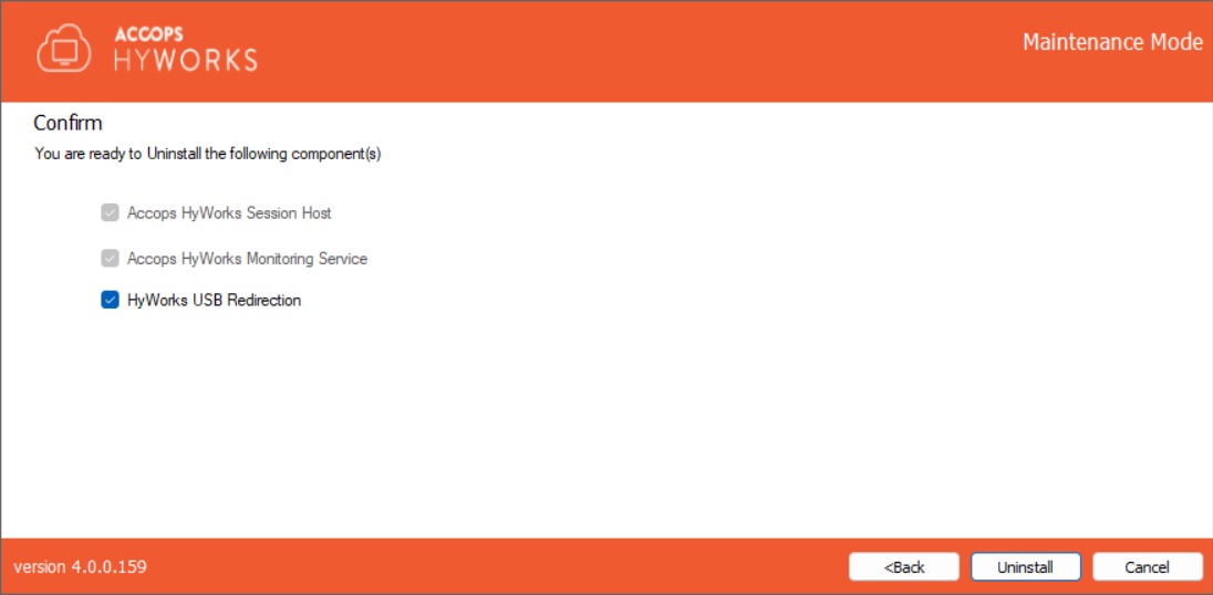 Click Uninstall to continue. This will remove all HyWorks Session Host Server modules from the system.