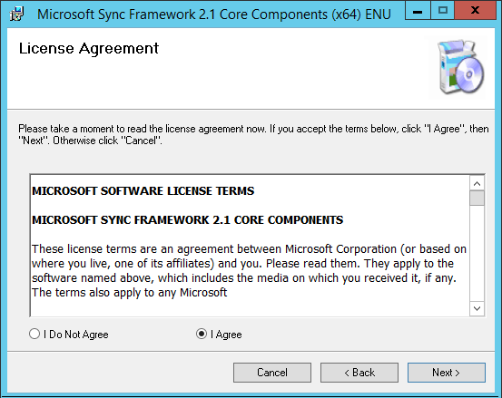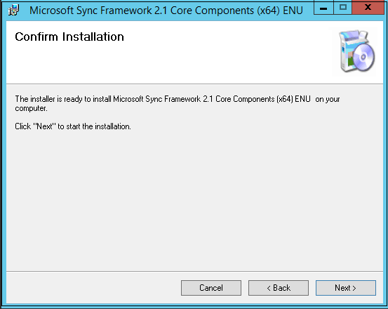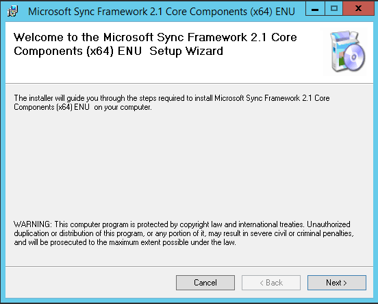 Download the setup from the URL specified above to install the Microsoft Sync Framework and follow the Installation wizard. The detailed steps are provided in the section Prerequisite-Install Microsoft Sync Framework 2.1(KB2703853).