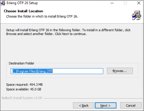 Select the installation location for ErlangOTP, then click Next.