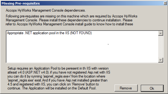 The error is displayed while installing Accops HyWorks Management Console, though .Net 4.5 has been installed and ASP.Net is enabled in Windows Server 2008 R2 machine.