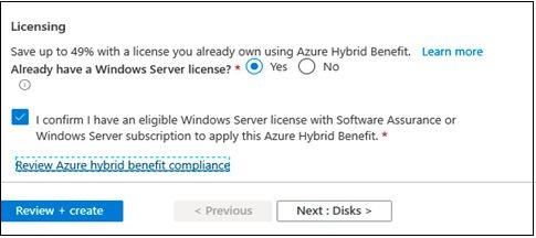 Using Azure Hybrid Benefit, you can save a lot in Azure with Windows Server Software Assurance. If your organization is eligible, you can enable the benefit while creating a Windows Server VM.