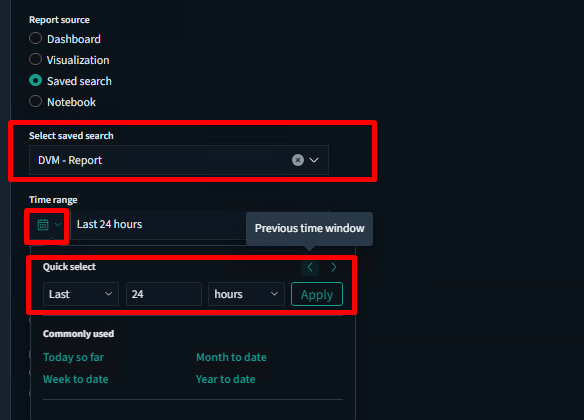 Select the option: Saved search. Select the Time range as required. Here we are setting it for 24 hours.