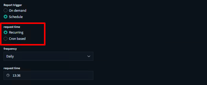 Recurring: By selecting the recurring option, we can schedule reports using frequency: daily or by interval, by setting up the request time. Here, I have set the report time to daily at 13:36.