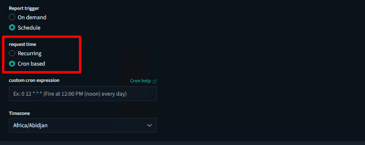 Schedule: Reports can be scheduled by selecting a specific time. We have two options for scheduling request times.