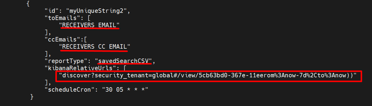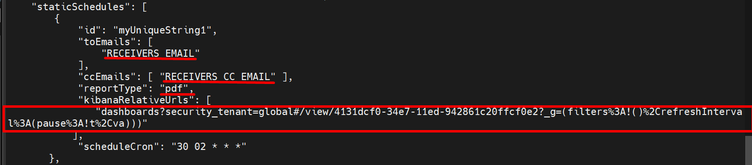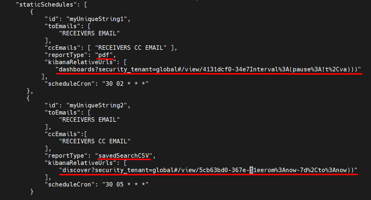 Combination of both Schedules: You can add both types of reports in one config.json file by adding the configuration. Add Receivers’ emails, report type and kibanaRelativeUrl in both the blocks. The configuration is the same as we see in the above two schedules.