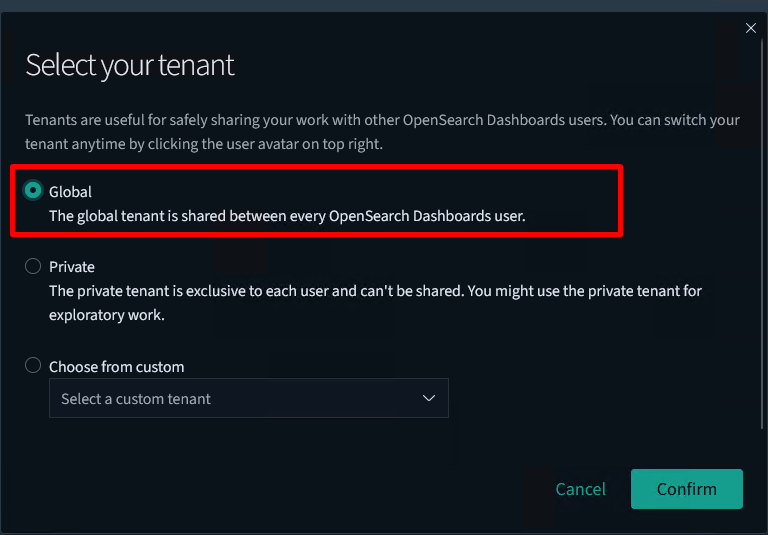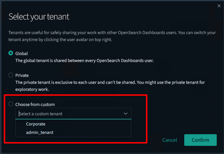 Tenant allows you to organize your dashboards, visualizations, and other saved objects into meaningful categories. Each tenant is independent, so objects that exist in one space don't clutter other tenants.