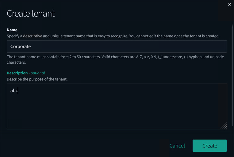 Enter a Name and Description (this field is optional) for the new Tenant.