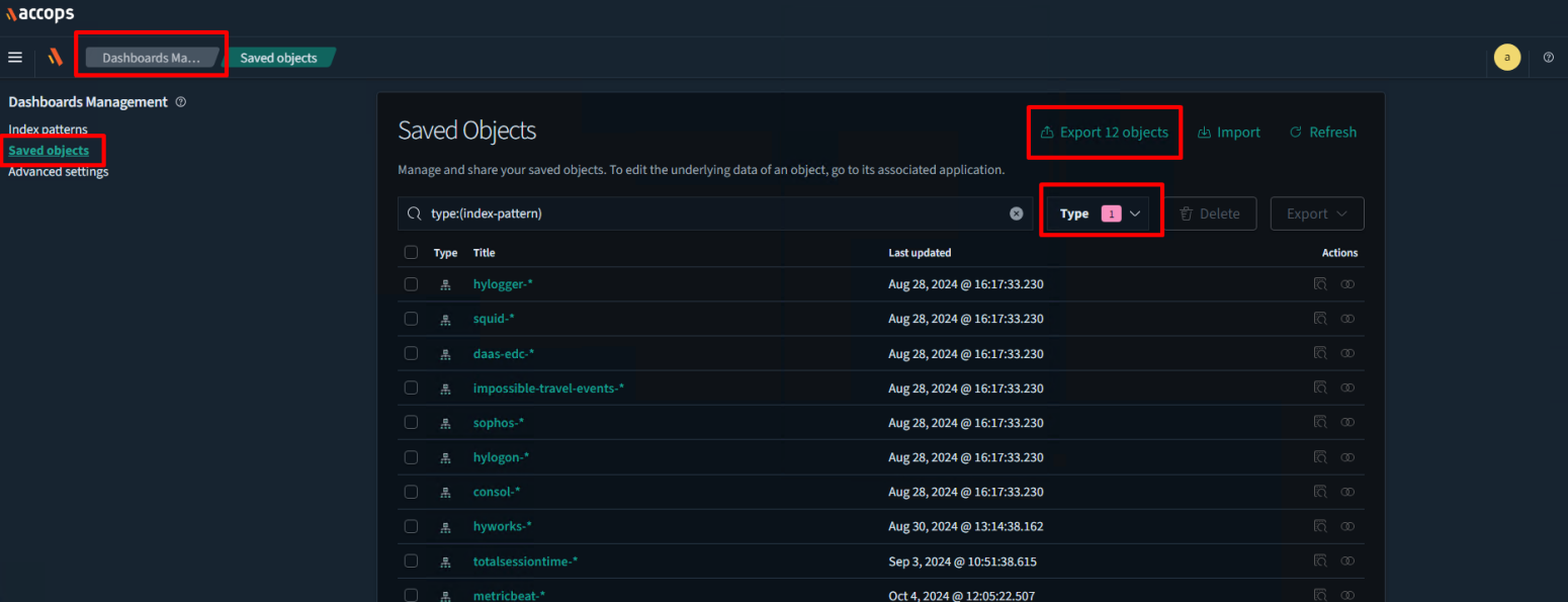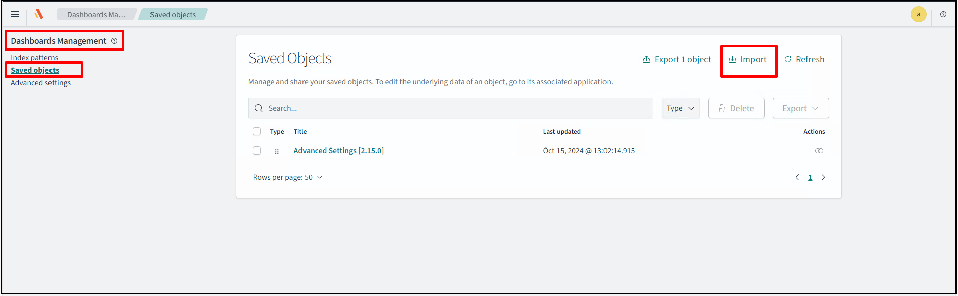Navigate to Dashboard Management > Saved objects.