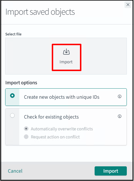 Navigate to Dashboard Management > Saved objects. Click Import and select the Jason file that was exported in the previous step.