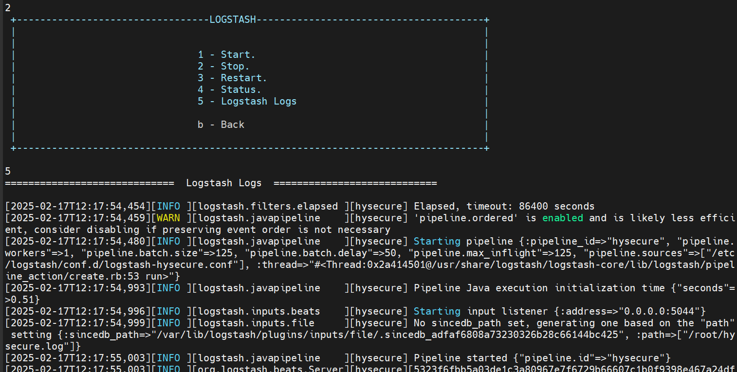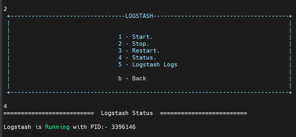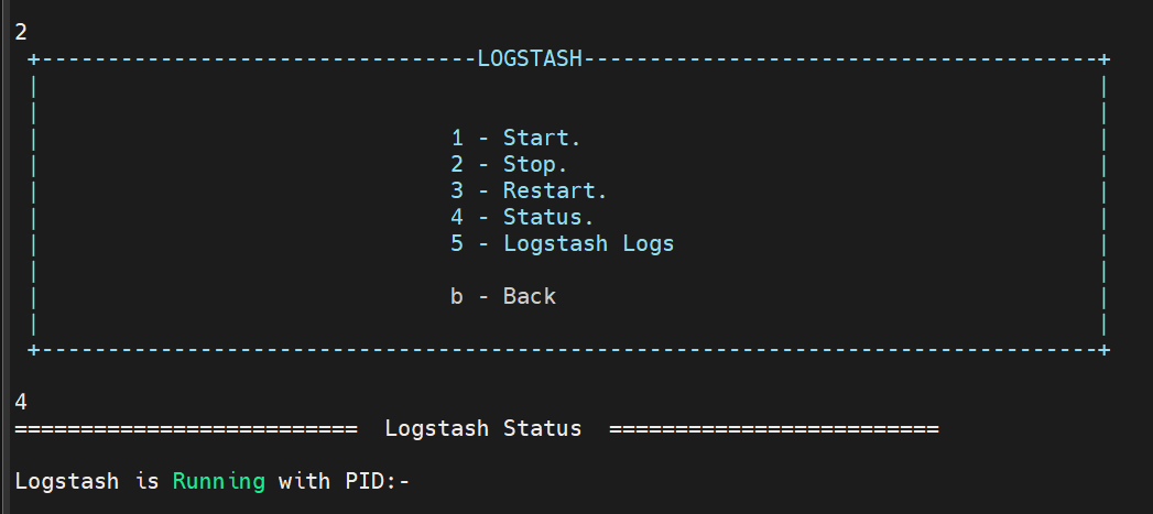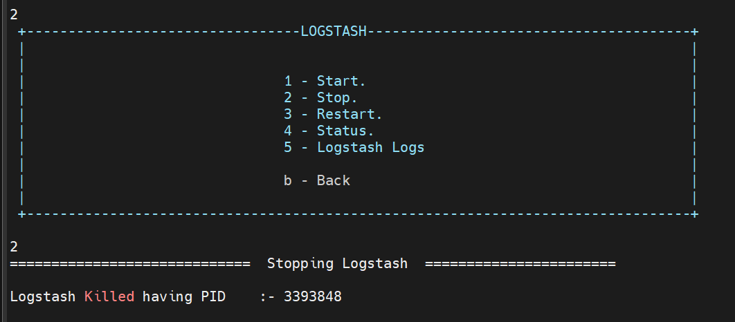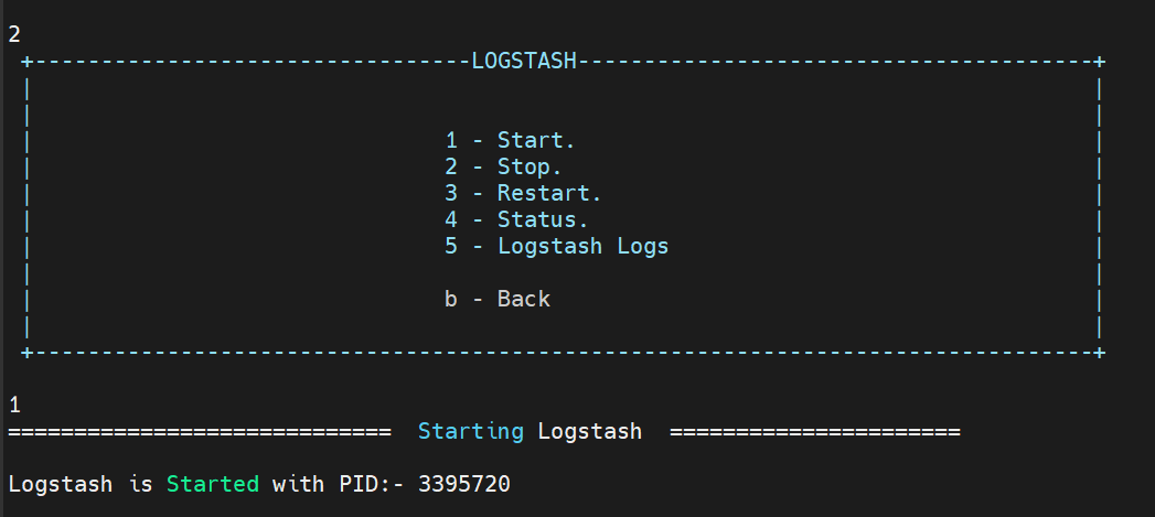 Start Select this option to start Logstash. Before selecting this option, make sure to check its Status using option no.4. If the status of logstash shows nothing, only then select this option.
