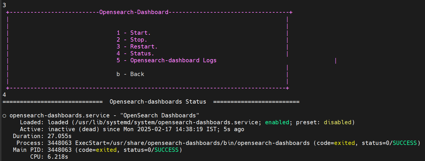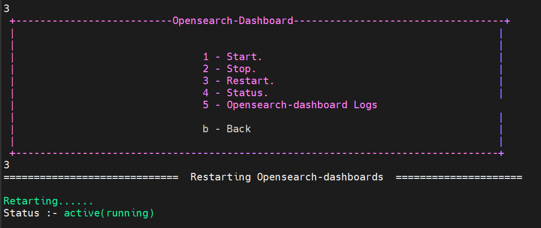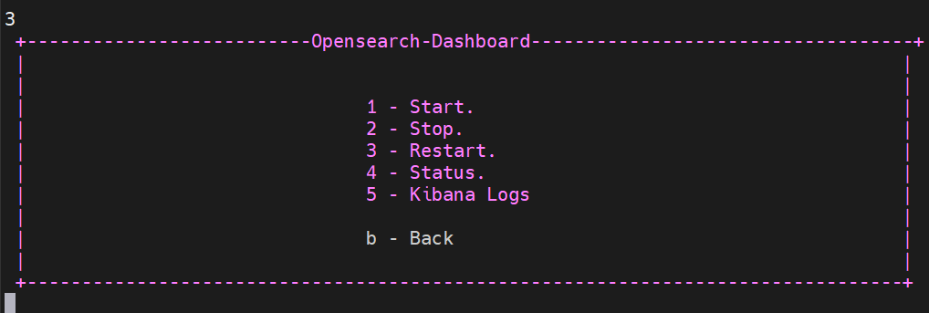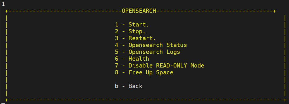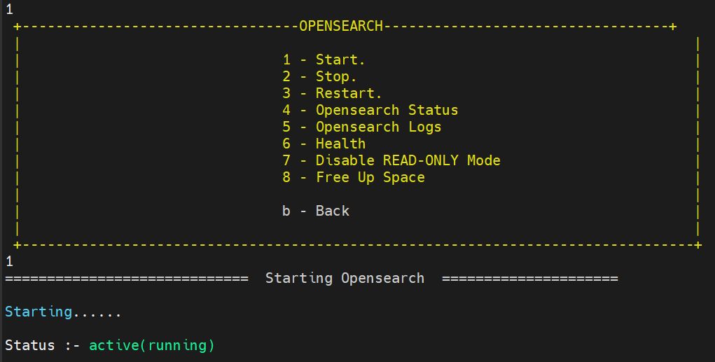 Select this option to start Opensearch. Before selecting, check the Opensearch status using option 4 (Opensearch Status). Use this option only if the status of Opensearch is showing as inactive (dead).