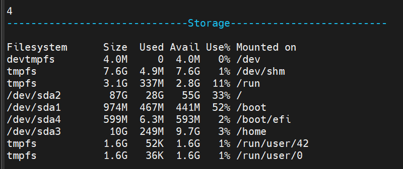 This option displays the Size, Memory used, available memory, user percentage, etc.