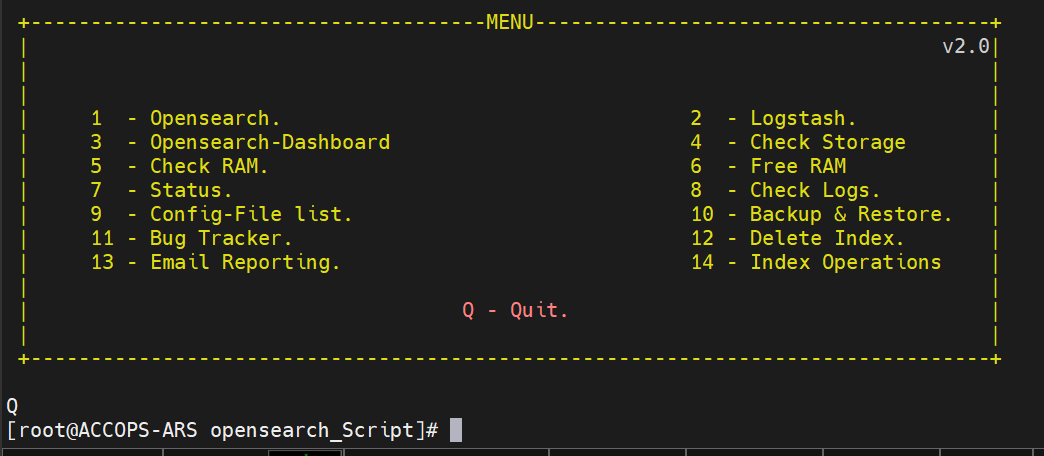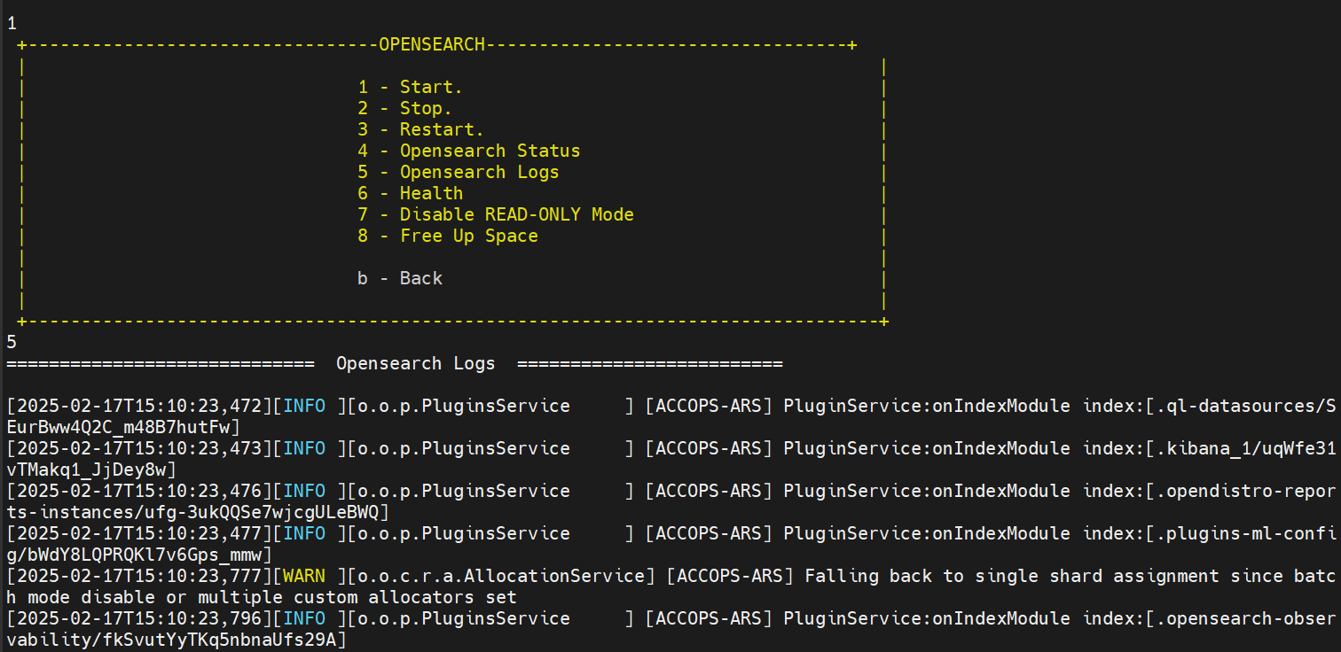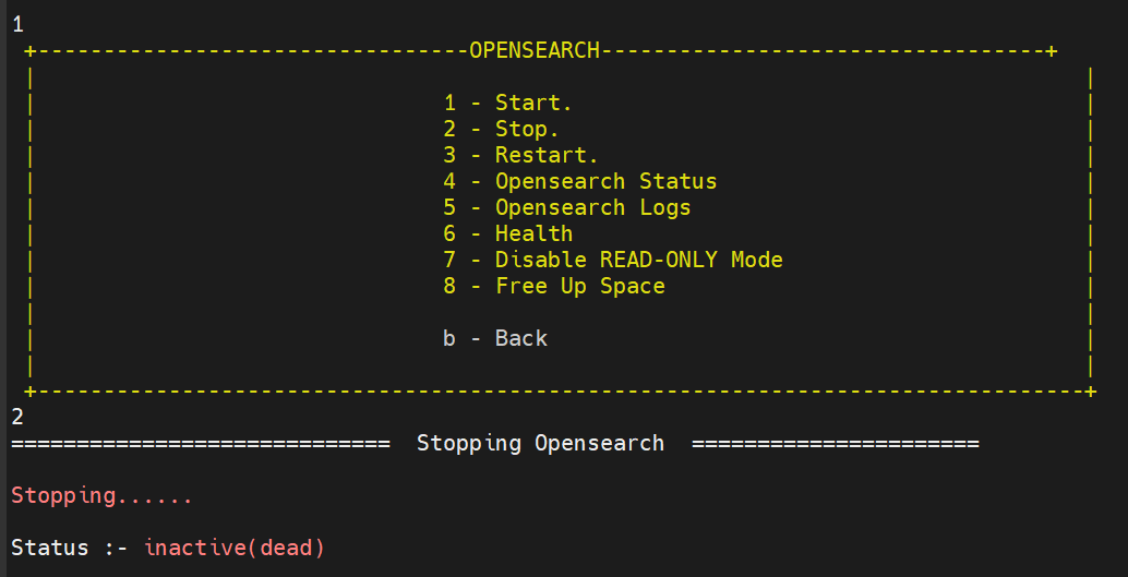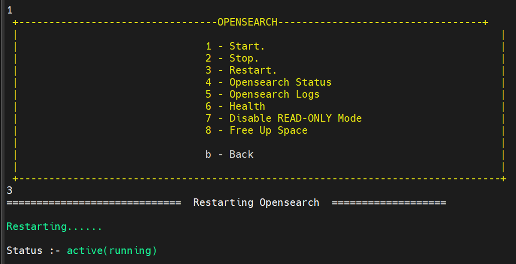 After starting the Opensearch service, it is mandatory to check the Opensearch Health (option no.6) and proceed with further operation if and only if the health of Opensearch is YELLOW.
