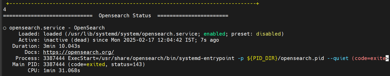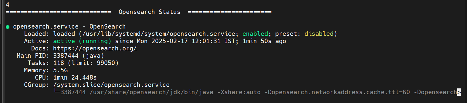 Running Status: This indicates Opensearch is running along with the time since it was started.