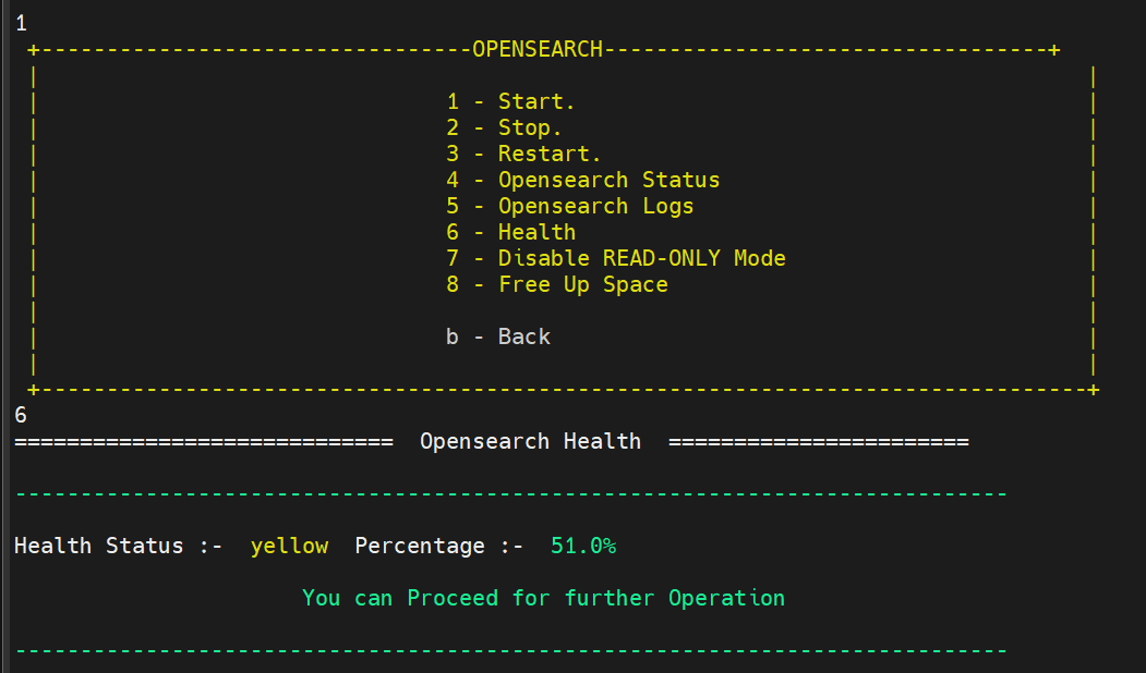 After starting the Opensearch service, it is mandatory to check the Opensearch Health. Enter option 6 and proceed for further operation if Opensearch health is displaying a YELLOW colour.