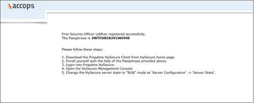 Registration confirmation screen will appear. The Accops HySecure Server will mail the Root Certificate (cacert.cer) and the Passphrase to the the specified email address of the first Security Officer. But it is recommended copy the passphrase, in case this email isn't received. Passphrase is required to enroll the first Security Officer Account and log in to the Management Console.