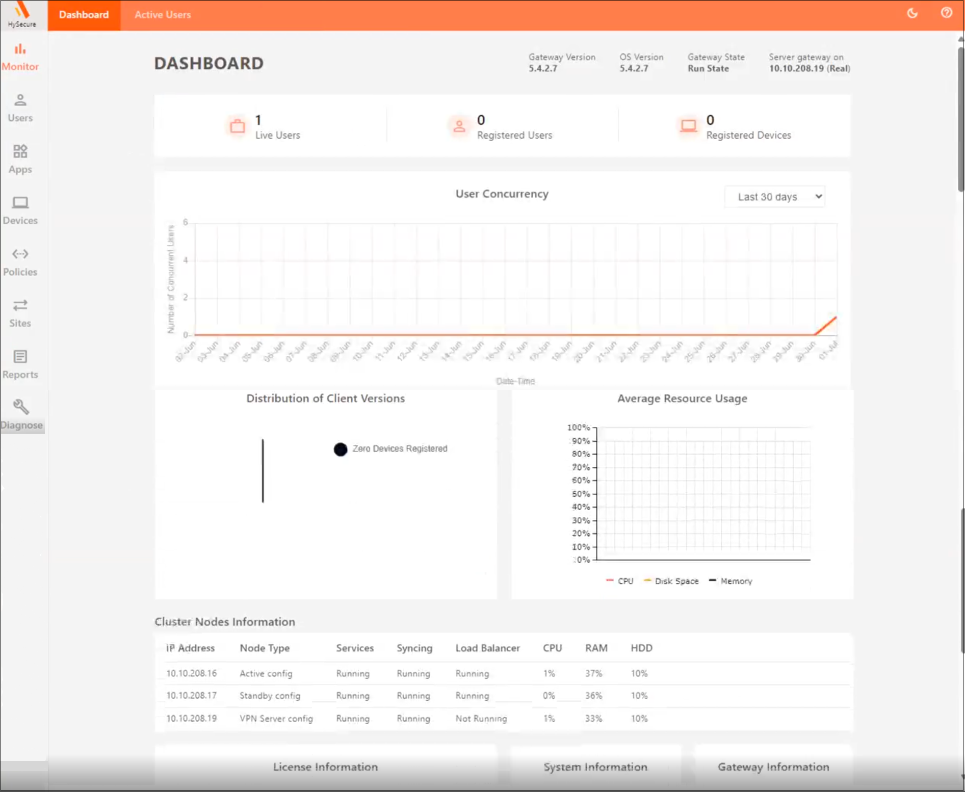 The sizing of the cluster depends upon the number of sessions. HySecure supports a maximum of 20 Real Nodes.