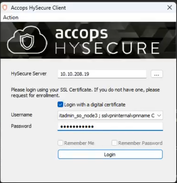 - Open a HySecure client instance. Select the box Login with a digital certificate and enter the password. Click Login.