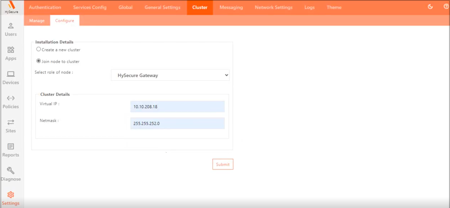In the Installation Details section select the Join node to cluster option. Select role of node as HySecure Gateway.