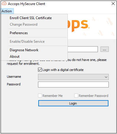 1. Open a HySecure client instance. Select the box Login with a digital certificate and enter the password. Click Login.