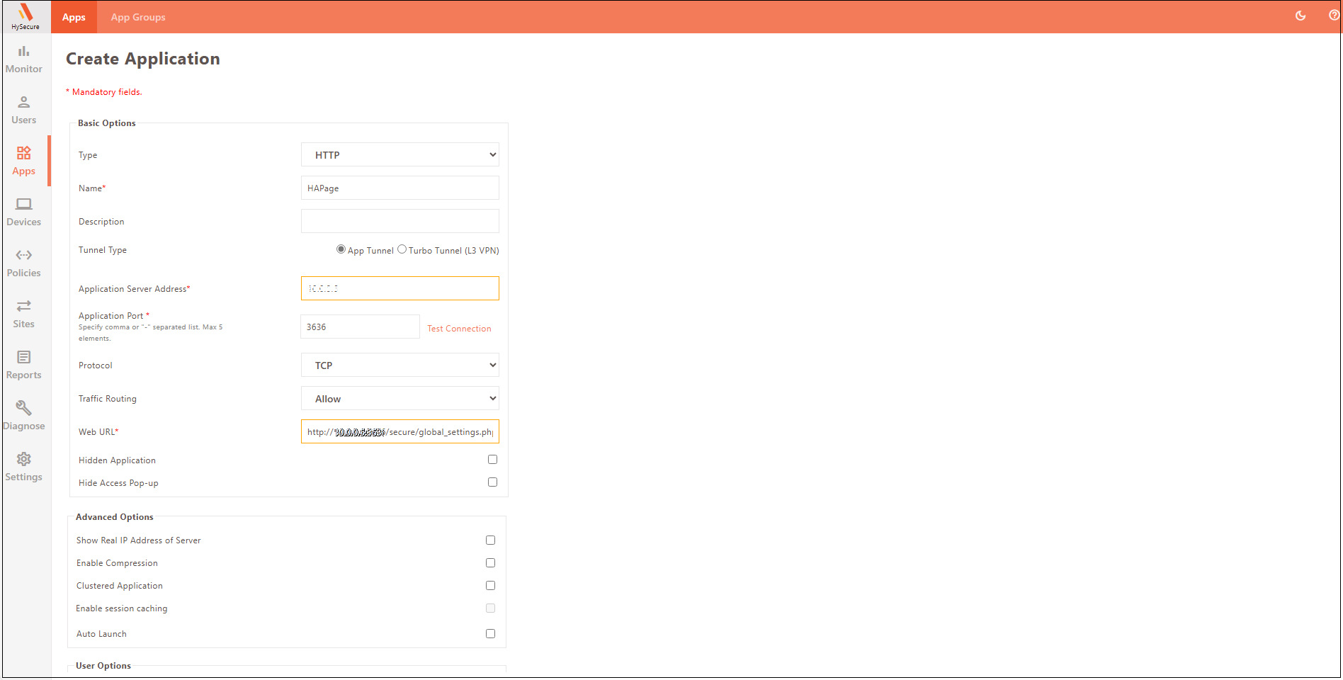 2. Add a new HTTP-type application, set the Application Server Address as the virtual IP address, and set the port as 3636. Provide the URL as http://hysecure_virtual_IP_address:3636.