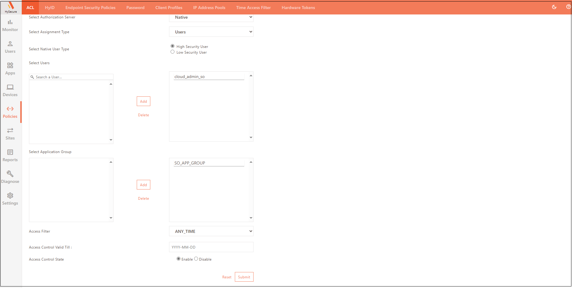 4. Navigate to Policies > ACL > Add. Create an Application Based Access control using Native as the Authorization Server for high-security users for the SYSTEM user group and assign the newly created High-Security application group.