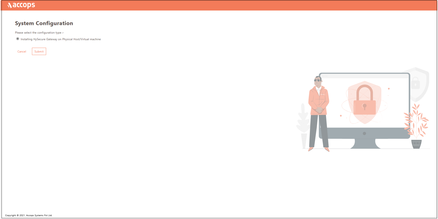 3. Select the configuration type Installing HySecure Gateway on Physical Host/Virtual machine from the System Configuration window and click Submit.