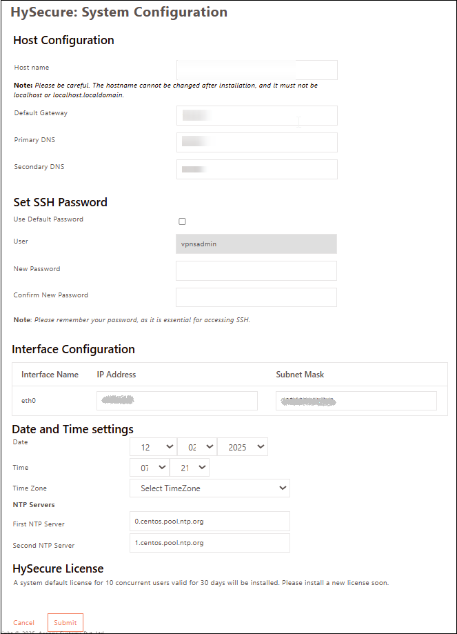 • NTP Server address: The Network Time Protocol (NTP) server address with which the HySecure will synchronize. This is crucial for maintaining accurate time across the network and ensuring that certificates and system logs are correctly timestamped.
