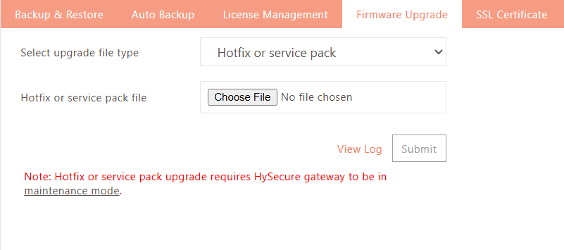 For Firmware Upgrade, put the HySecure gateway in Configuration State. Navigate to Settings > Service Config > Gateway State and change the HySecure gateway state to Configuration State. Once the mode is changed, all the active user connections to this gateway node will be disconnected.