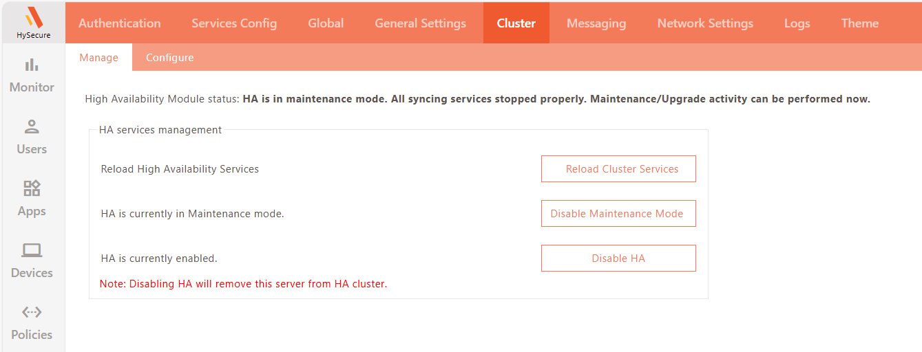 Now go to Settings > Cluster > Manage and click Disable Maintenance Mode.