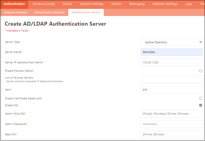 | Enable SSL | Enable if encrypted communication with the AD is expected. In this case, the Port field should contain the port used for encrypted communication with AD, which by default is 636. This should also be checked when the AD password can be changed from HySecure using the Self Service Portal, as the password change needs to be encrypted. |