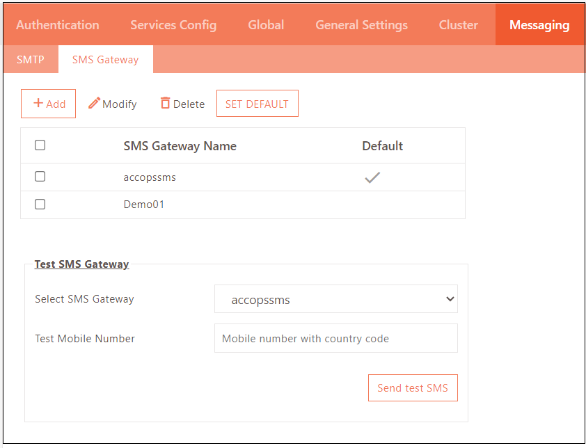 The administrator can select the desired SMS Gateway and set it as default using this option.