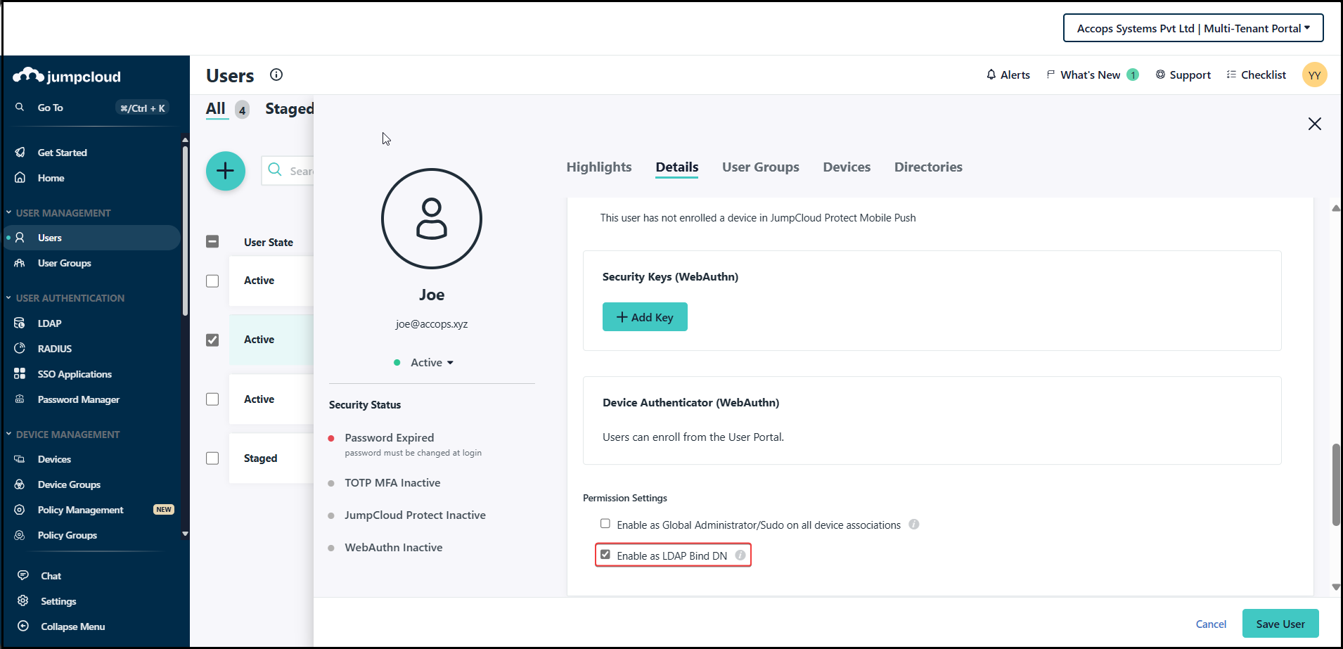 c. Under User Security Settings and Permission > Permission Settings, check the box next to Enable as LDAP Bind DN. When enabled, this user acts to bind and search the JumpCloud LDAP directory.