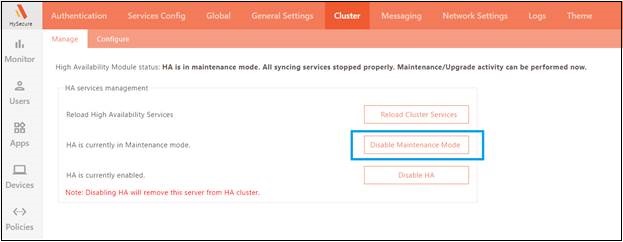 Navigate to the HA Configuration page and switch the HySecure node to Maintenance Mode. This gateway node will no longer be part of the cluster and none of the nodes in the cluster will show the status of the cluster.