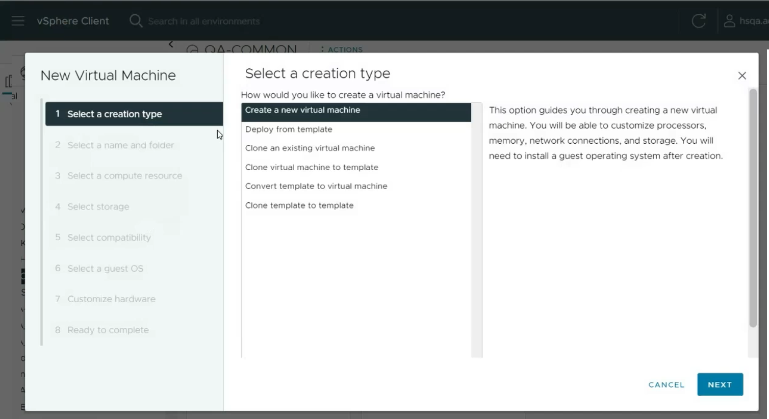 - Select the Create a new virtual machine option in the New Virtual Machine creation wizard.