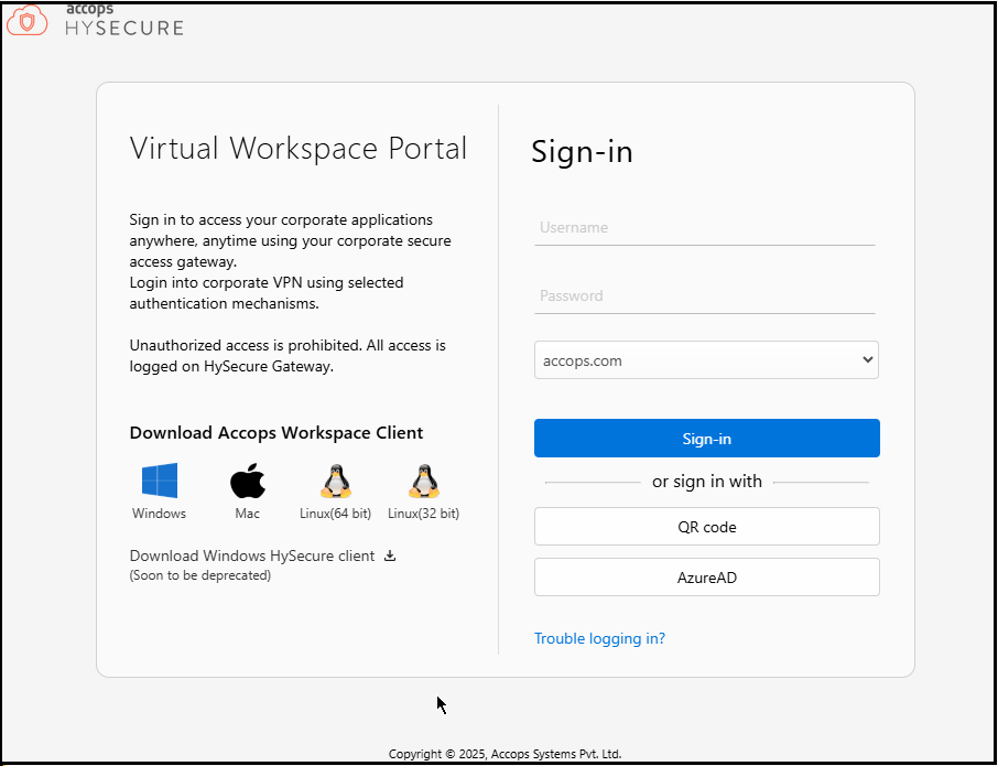 Accops HySecure Desktop Client is a small-footprint, self-upgrading client that logs on to the Gateway without using a web browser. The HySecure Client for Desktop also supports non-Windows platforms like Mac and Linux OS.
