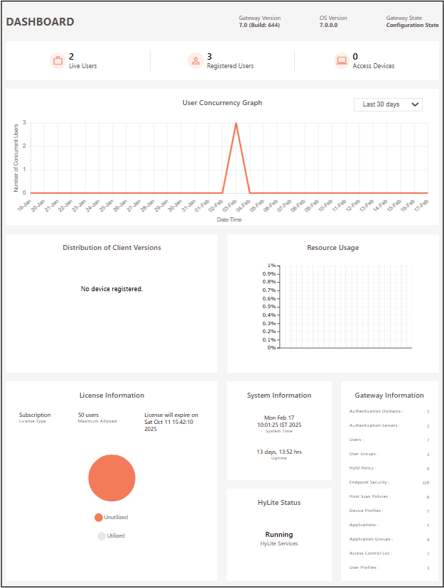 Accops HySecure has a web-based management console for easy and centralized user management, session management, policy management, and server configuration control. The console also provides a graphical dashboard showing live users, license usage, resource usage, and important gateway information. Reports of user activity can be generated and downloaded. The management console has built-in granular administrative roles. There are two types of administrators: Security officers and Administrators. The Security Officers and the administrators must log in using the certificates provided by either a third party or generated locally by the HySecure device.