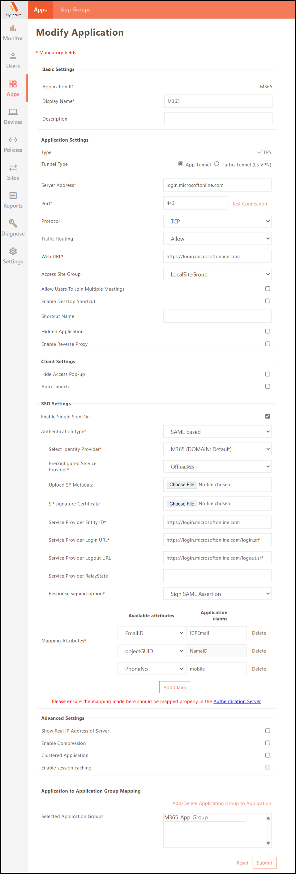 Steps to use HySecure as an Identity Provider (IdP) for a SAML-based Microsoft 365 application: